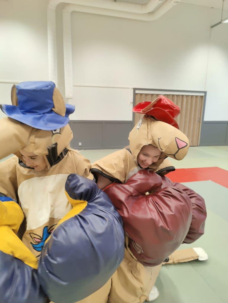 Järjestämme kengurupukujen kanssa erilaisia pelimuotoja perinteisen nyrkeilyn lisäksi.
